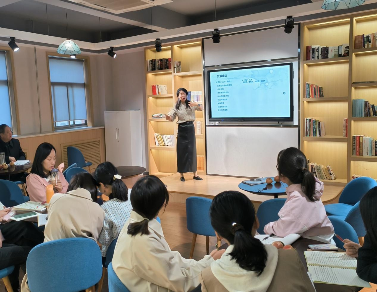 赵保成副院长对本次外出培训成果转化进行了总结发言,指出教师外出培训成果转化能够突出教师培养培训实效,不仅有利于开阔教师们的视野,而且有益于教师教学技能的提升。通过此次外出培训转化会议,希望商务英语专业教师能够结合自身的教学实际多思考、多实践,将课堂教学实践与科学研究相结合,在课堂教学中发现问题,研究问题,再用科学研究反哺教学实践,形成互帮互助、人人向上的良好教风,为打造外语高素质教师队伍起到示范引领作用。