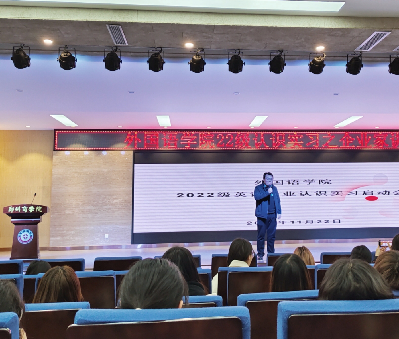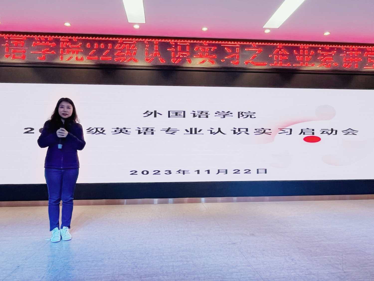 为帮助学生加深学生对本专业课程及职业认识,带领其理解英语专业相关行业就业概况,激发其对后续课程学习的热情和动力,2023年11月22日,我院英语专业在自力楼三楼报告厅召开2022级英语专业认识实习启动会。我院副院长赵保成,英语专业教研室主任程玮,认识实习负责教师张艳玲、李娜、杨嘉琪、刘文婷等出席本次启动会。启动会由程玮老师主持,2022级英语专业全体学生参加此次会议。