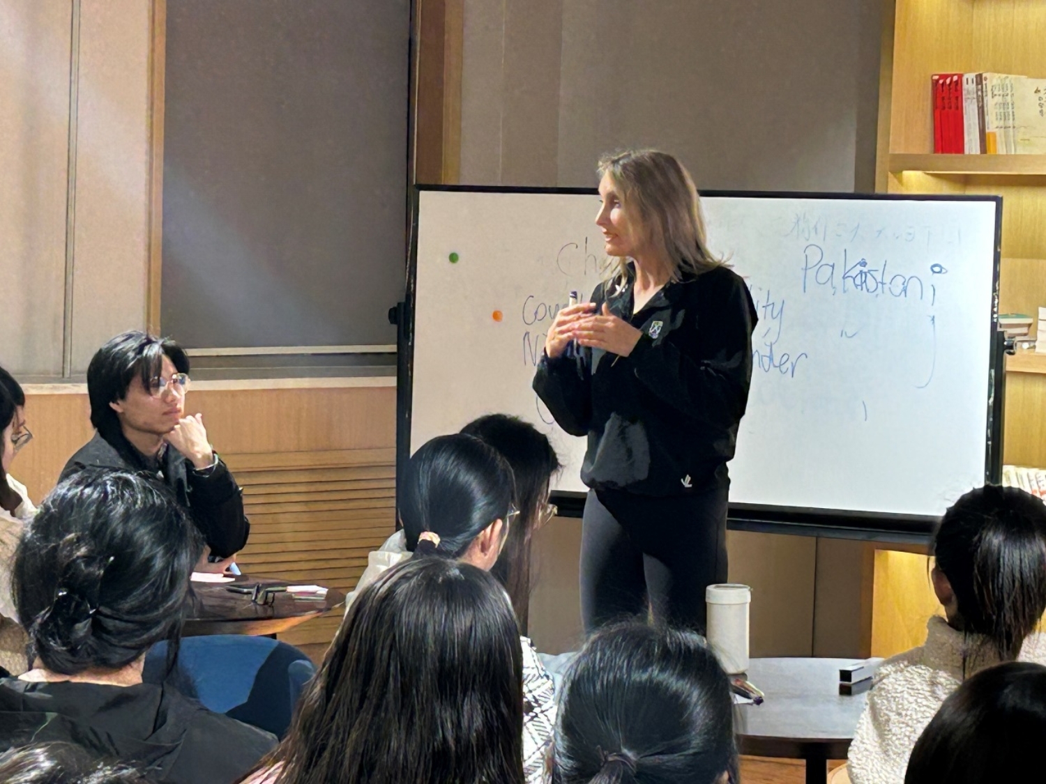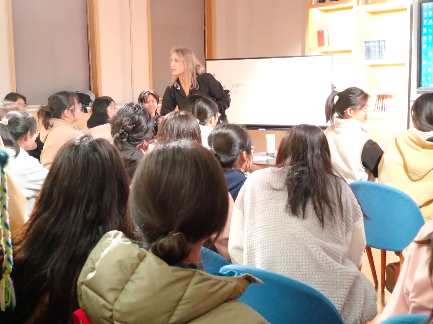 活动伊始,外籍教师Kerin 为大家介绍了本次活动的主题 “如何提高英语发音准确度和口语流利度”,并用提问的方式调动学生的参与热情。接着,外教在英语语音、语调、口语表达等方面为同学们进行了深入的讲解。通过介绍不同国家英语发音的不同,学生更加深刻的认识了英语作为沟通交流的工具,准确发音的重要性。活动末尾,学生纷纷与外教交流感想,并总结所得。
