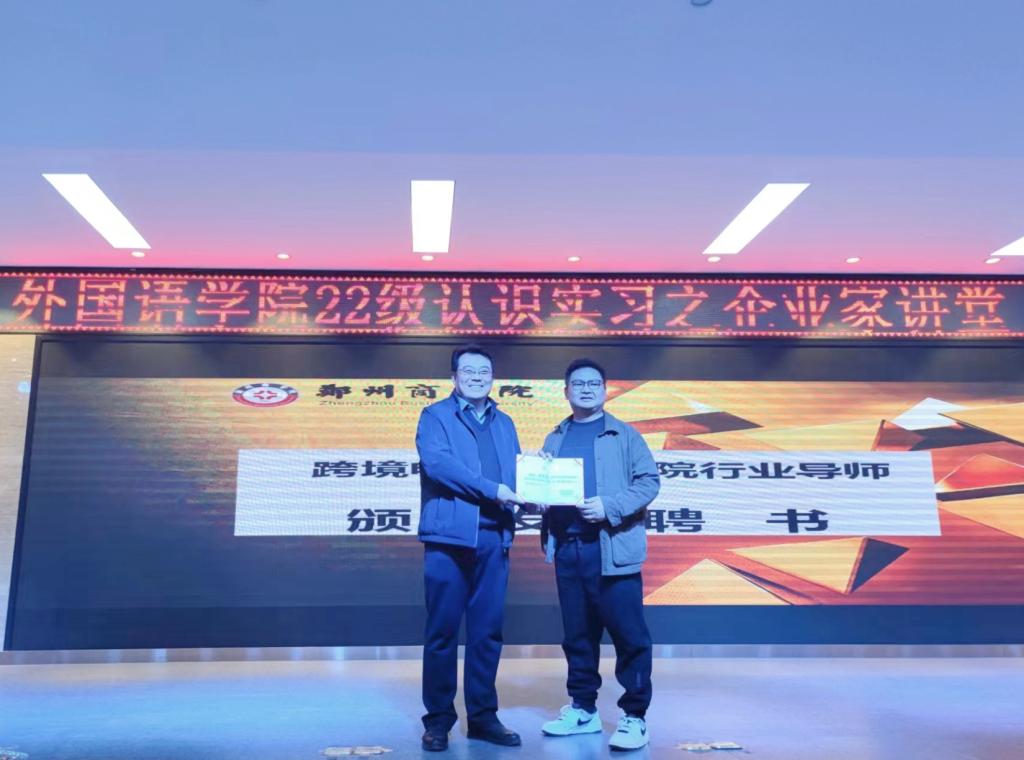 最后,赵保成副院长为两位企业家颁发了冰球官网跨境电商行业学院行业导师聘书,并要求同学们认真总结学习企业嘉宾报告内容,优化大学学业规划,夯实英语语言基础,强化专业学习与商务能力提升,实现未来在外贸与跨境电商领域就业创业。