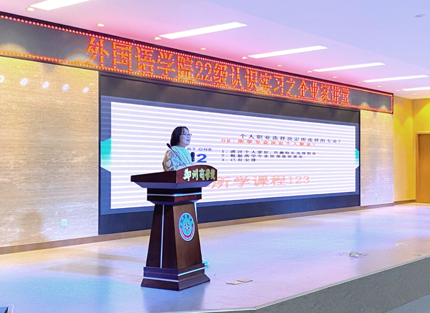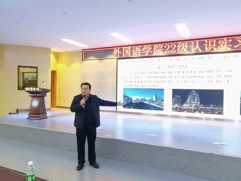 为落实产学协同育人理念,推动人才培养契合行业发展需求,实现我院高质量应用型人才培养,扎实开展专业认识实习实践教学活动,11月22日下午,我院商务英语、英语专业于紫荆西校区自力楼报告厅为22级学生举办“企业家讲堂”活动。本次企业家讲堂邀请河南绿源水处理科技有限公司总经理王景霞、阿里巴巴国际站巩义服务中心销售总监钟学茂作为主讲人。我院党委书记王克志、副院长赵保成、商务英语教研室主任葛莹辉、英语专业教研室主任程玮、就业专员兰敬高、辅导员刘宁、商务英语教研室及英语教研室认识实习负责老师,以及22级商务英语专业、英语学生参加了此次活动。