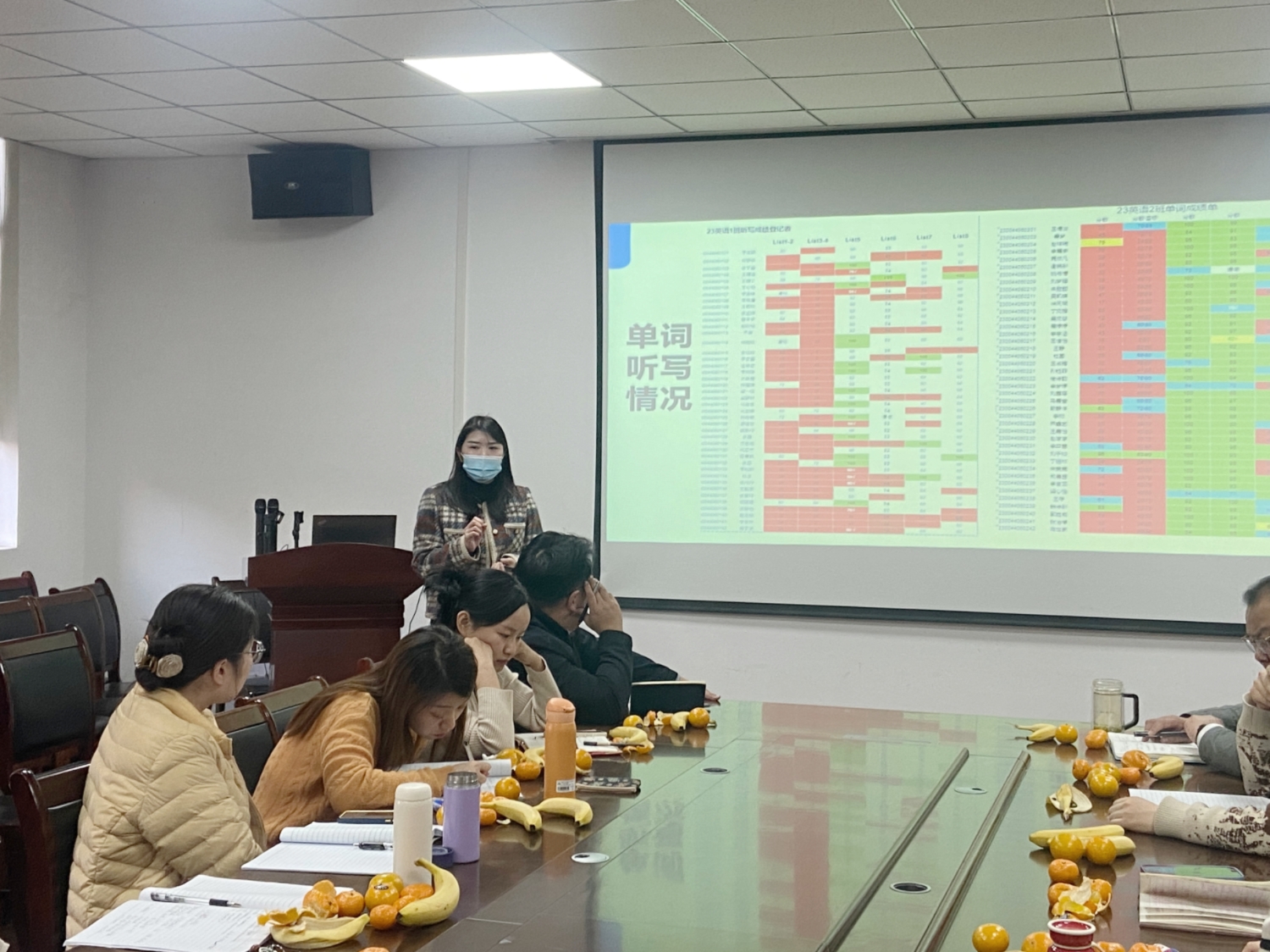 接下来,英语、商务英语、翻译、日语、德语等5个专业基础语言课程教师逐个汇报“强基”教学实践。老师们用作业检查表格和作业检查图片展示了在安排学生开展词汇积累、文段背诵、课外阅读、四六级辅导等强化语言基础的教学活动,并总结了在教学工作的心得体会与不足。汇报过程中,多数老师展示内容丰富,能够敦促学生每周完成一定量的词汇识记,每两周完成一次文段背诵,教材教学能够结合语言等级考试内容。也有2-3名教师汇报内容较少,检查学生作业不规律,次数少,作业形式单一等,为此,学院也给予了提醒与指导,同时希望老师们提高教学效率,利用数字教学平台与教学APP等进行监督和作业批改,跟踪学生的学习情况,为他们提供个性化的指导和帮助。