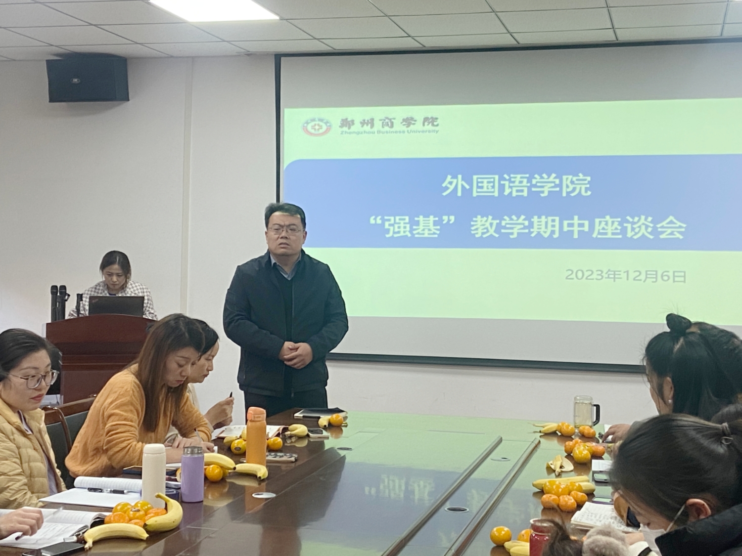 座谈会由副院长赵保成主持,他首先带领基础语言课程教师回顾了“强基”教学计划的意义与重要性,强调了“综合英语”“基础日语”“基础德语”等课程是外语专业学生基础与根本,是外语专业学生未来升学与高质量就业的重要支撑作用,要求各基础课程组务必坚持按照“强基”教学计划,认真扎实开展教学与作业检查。接下来,他要求各教师汇报本学期“强基”教学实践,通过汇报,审视自己对学生学业负责程度,展示学生作业检查质量与次数,反思自己在学生学习习惯养成方面的引领作用。