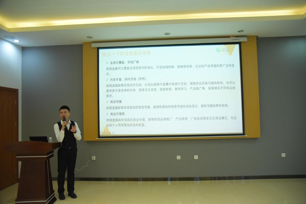 为引领学生了解跨境直播趋势及未来发展方向,打造商务英语专业跨境电商特色,我院于12月11日晚在图书馆五楼报告厅举行跨境直播专题讲座。本次讲座特邀福建亿学集团产品经理聂威老师为主讲人,为21级“跨境电商英才班”学员及外院学院首届“跨境电商外语直播大赛”的参赛选手带来了一场别开生面的专题讲座,我院院长邱培磊、商务英语教研室教师李明豪、周璐、王玉等参加此次讲座。讲座由商务英语教研室主任葛莹辉主持。