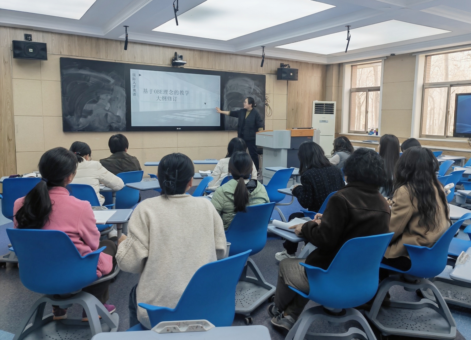 首先,由22级文科教研组组长丁玲老师对负责的《国际人才英语》课程教学大纲修订优化方案进行了分享,丁老师针对课程目标、教学方法、教学评量等方面做了深入浅出的分析。