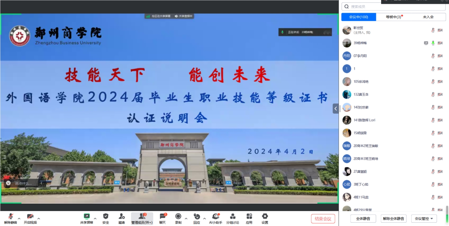 会上,专项负责人围绕“人人持证、技能河南”的背景与推进情况,及商务英语专业获取职业技能等级证书的途径与意义进行了详细的说明,使学生深入了解了此项工作具体的开展步骤。下一步,我院将按照学校对“人人持证、技能河南”的总体部署,继续发挥统筹协调作用,围绕已认定的职业工种开展“1+X”证书的考点申报及培训工作。