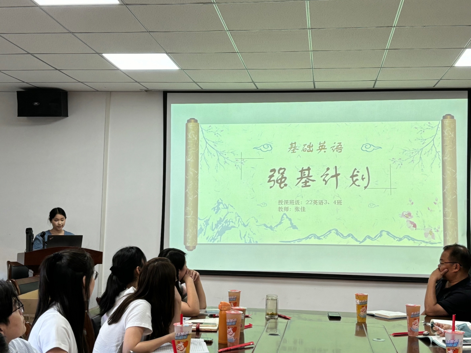 随后,英语专业张佳老师、翻译专业张明慧老师、商务英语专业翟茹洁老师、日语张诗笛老师和德语专业赵琦老师作为代表逐一对近阶段的“强基”工作进行了详尽的汇报。通过展示作业检查记录、学生作品和教学反思,教师们分享了各自在词汇教学、文段背诵、课外阅读和四六级、专四辅导等方面的实践经验和做法。同时,老师们也坦诚地提出了在教学中遇到的困难和挑战。