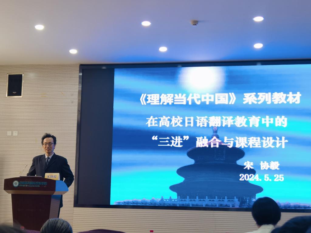 主旨报告环节,教育部日语专业教学指导委员会副主任委员、大连大学原副校长宋协毅教授以“《理解当代中国》系列教材在高校日语教育中的‘三进’融合与课程设计”为题做主旨报告,并指出新时代形势下我们要培养的是理解中国、沟通中国、立足中国、扎根中国的高水平日语人才。