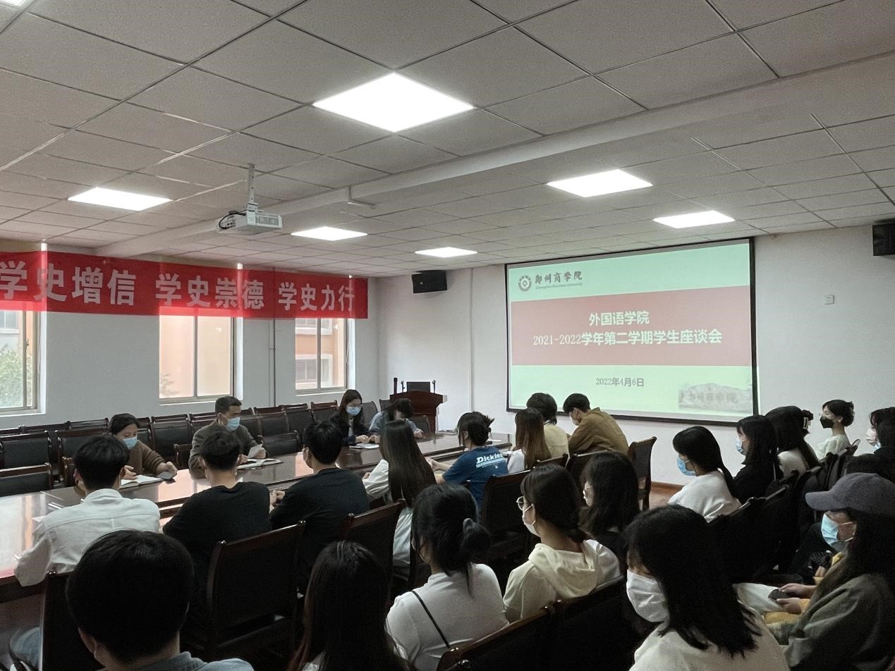 为加强关心了解学生的思想动态和学习生活状况,外语学院于4月6日下午在W209召开学生座谈会。党委书记王克志、团委书记张文娟、辅导员和各班学生代表参加了座谈会。