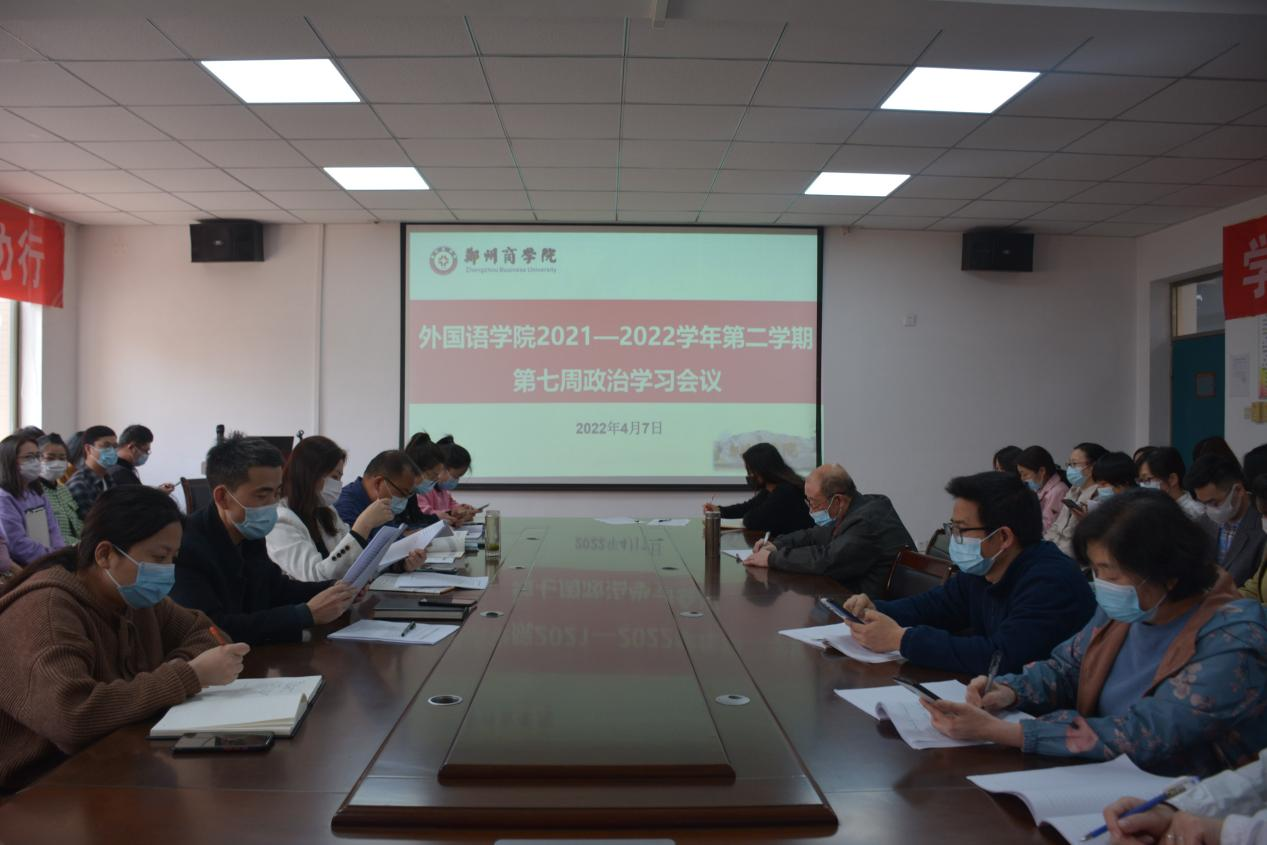 4月7日下午,外语学院组织无课教职工在外语楼209会议室进行本周政治学习,会议由外语学院党委书记王克志主持。会议伊始,王书记带领大家认真学习了《习近平总书记关于能力作风建设的重要论述(一)——能力方面》,以及《冰球突破mg正规官网2021-2022学年第二学期第一次主管会暨工作计划汇报会会议纪要》。会上,王书记强调,“能力作风建设年”活动作为2022年的一项政治任务,要认真组织,扎实推进,确保活动取得满意效果,实现党员干部能力大提升、作风大转变,为推动冰球官网事业高质量发展提供坚强保证。