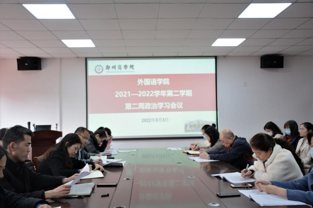 外语学院于3月3日下午14:30在外语楼209会议室召开本周政治学习会议,党总支书记王克志,院长王勃及全体教职工参加。王书记组织全体人员深入学习《关于加强和改进新时代师德师风建设的实施意见》、习近平在中央党校(国家行政学院)中青年干部培训班开班式上发表的重要讲话。随后结合工作实际,王书记对学院教师提出以下要求:大家要加强理论学习,提高党性修养,锤炼过硬本领,以忠诚干净担当的实际行动,自觉担负起党和人民赋予的育人使命。同时,要提高政治站位,坚定政治方向;坚持党建引领,落实主体责任;多措并举,提升道德素质,建立一支有理想信念、有道德情操、有扎实学识、有仁爱之心的教师队伍。