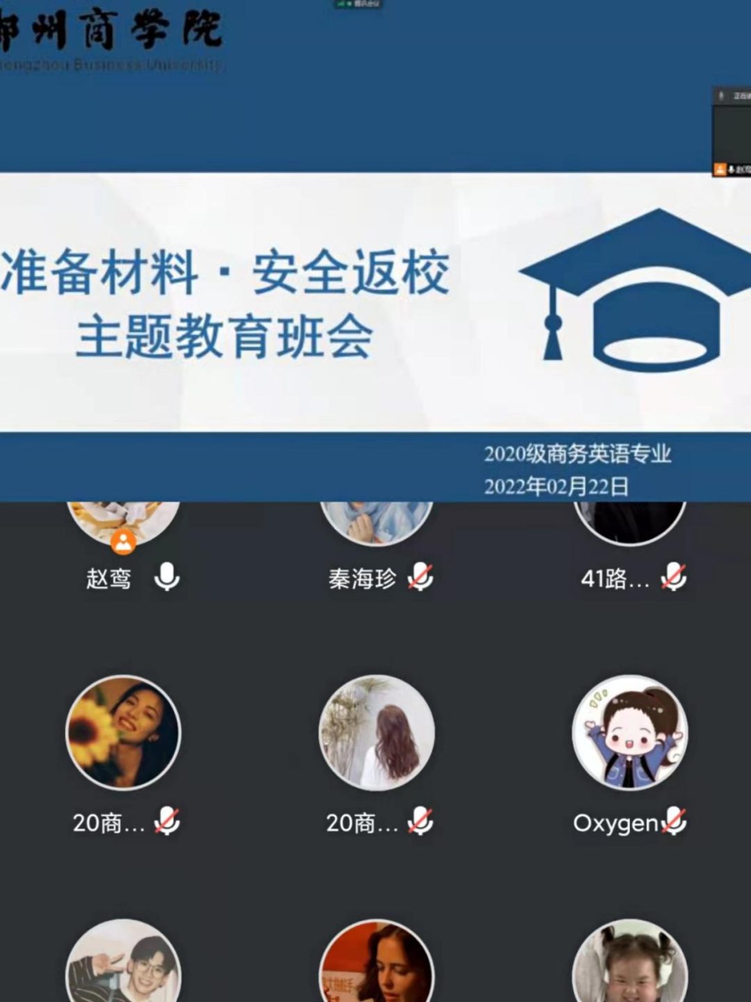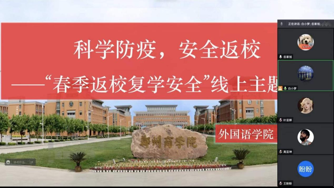 寒假假期逐渐落下帷幕,新的一学期即将到来。2月22日,外语学院各班召开了2022年春季学期安全返校线上班会。提醒同学们按时返校,并核查自己的健康码、行程码是否有异常情况,如有异常需要及时告知辅导员并暂缓返校。返校前自行进行核酸检测;返校途中做好个人防护、与家长保持联系;返校后按时参加校内全员核酸检测,确保学生安全。