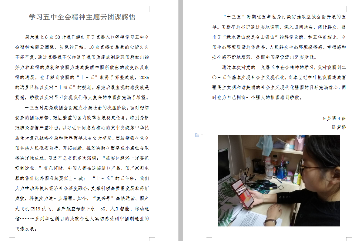 各团支部都认真学习了此次团课,团支书更是在此基础上,深入到班级中去宣传十九届五中全会精神,去了解同学们所想,去解决同学们的困惑。本次云团课向同学们全方位解读了第十九届五中全会精神以及2035年基本实现社会主义现代化远景目标,使同学们受益匪浅。同学们纷纷热血沸腾地书写对全会精神的感悟,用她们质朴的语言表达了自己将不忘初心、好好学习、砥砺前行,不断丰富自己的阅历,为祖国创造更美好的明天。此次团课学习充分帮助同学们感悟到党领导人民建设祖国新的伟大成就,增强了同学们的自信心,实现了本次团课的目的。