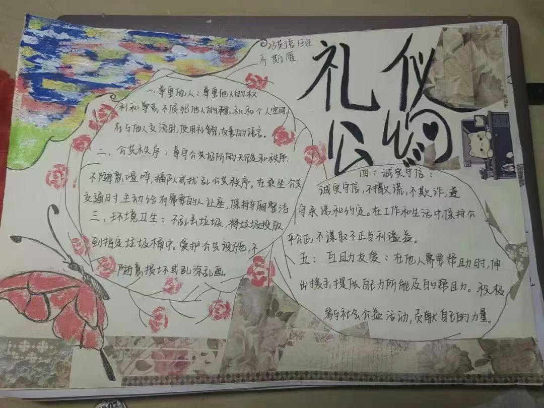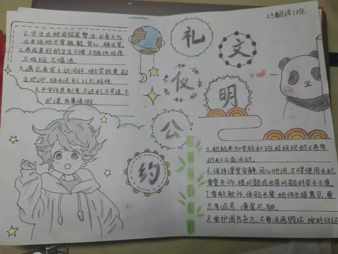 为进一步丰富校园文化生活,加强外语学院学生文明礼仪建设,优化育人环境,营造良好的礼仪学习生活氛围,我院于4月9日至4月11日特开展“文明礼仪伴我行”礼仪公约制作活动。在这次活动中,外国语学院大一全体在校学生以班级为单位,通过讨论、协商,共同制定了一份适合且专属于各自班级的文明礼仪公约。