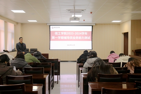 为深入学习贯彻习近平新时代中国特色社会主义思想和党的二十大精神,提高辅导员理论水平、职业能力和专业素养,努力建设一支专业化、职业化、专家化的辅导员队伍,12月21日下午,我院在信工大楼B310会议室开展辅导员基础业务测试。全院共24名辅导员参考,学院党委书记周余、团委书记张璐阳担任此次辅导员业务测试的监考官。