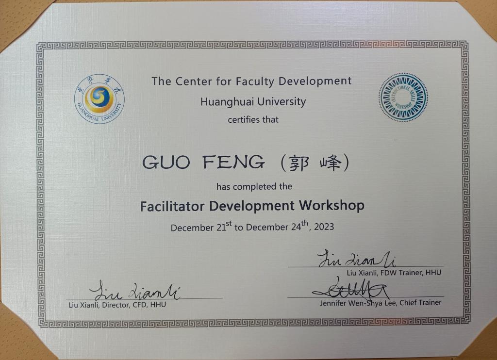 2023年12月20日-24日,我院网络工程教研室副教授郭峰老师赴驻马店参加了黄淮学院教师发展中心第七期国际认证教学技能引导员工作坊(Facilitator Development Workshop,FDW)。