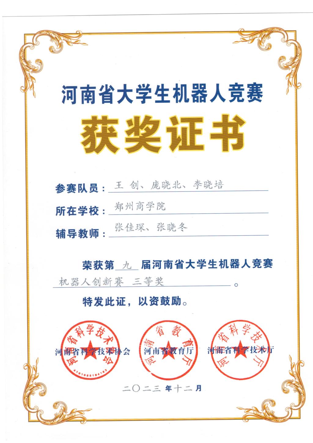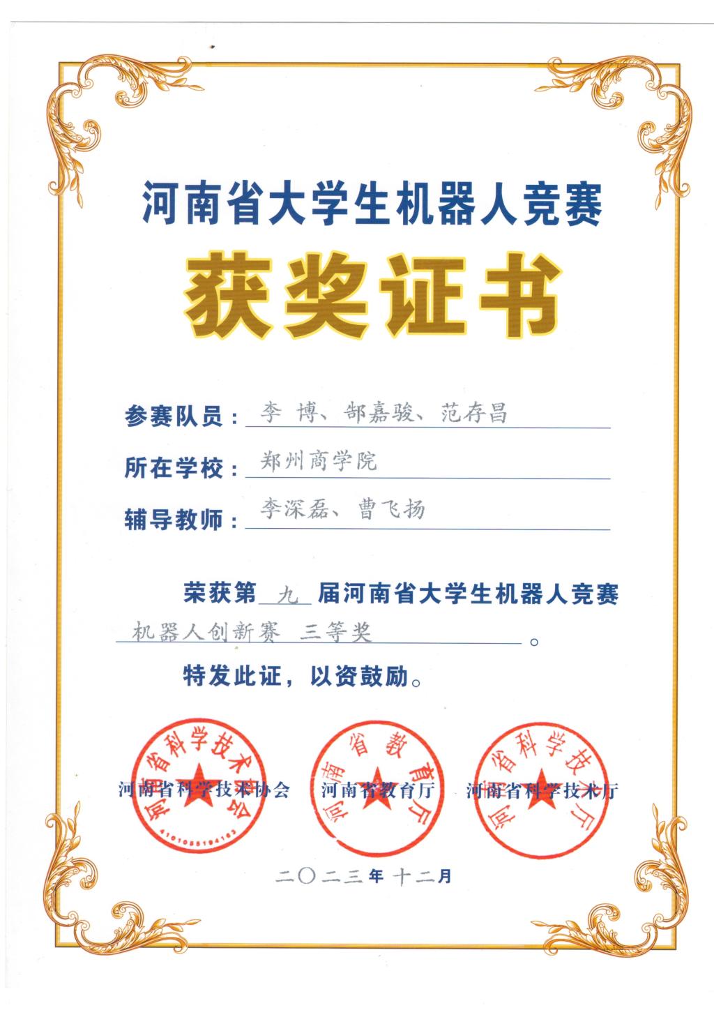 2023年11月17日-19日我院选拔了两支队伍参加第九届河南省大学生机器人竞赛机器人创新赛,均获得河南省三等奖佳绩。
