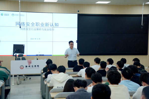 我院特邀河南网训(深信服SELP-C)副总经理、深信服人才培养基地(河南)主管、深信服百校行活动金牌讲师史彦武先生担任主讲人。史彦武先生在讲座中深入剖析了网络安全行业的现状、产业发展趋势以及未来的就业前景。他结合深信服在网络安全领域的丰富经验,为同学们揭示了行业发展的内在逻辑和潜在机遇。同时,他还结合当前就业市场的实际情况,为同学们分享了求职策略、面试技巧以及岗位选择等方面的宝贵建议。