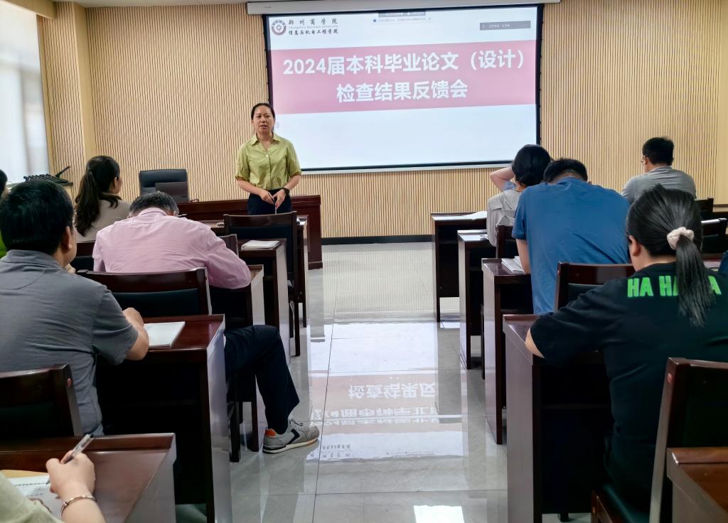 为确保我院2024届本科毕业论文质量,加强学术规范,信工学院于5月23日下午在三彩校区会议室召开了毕业论文检查结果反馈会。本次会议由我院张晓冬院长主持,校级教学督导组姚旭东教授、副院长张伟华副教授出席,并发表了重要讲话。信工学院全体论文指导教师参加会议,共同探讨如何提升论文质量。