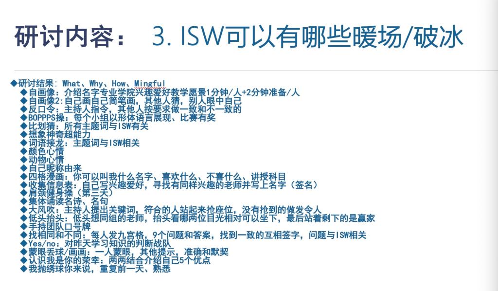 第三轮研讨要点围绕具体的暖场/破冰方式展开。例如“自画像”,包括介绍名字、专业、学院、兴趣爱好和教学愿景,以及自己画自己简笔画让其他人猜等形式;“反口令”,即主持人指令,其他人按要求做一致和不一致的动作;“BOPPPS操”,每小组以形体语言展现并比赛;“比划猜”,所有主题词与ISW有关;还有想象神奇超能力、词语接龙(主题词与ISW相关)、颜色心情、动物心情、自己昵称由来、四格漫画(涵盖可以叫我什么名字、喜欢什么、不喜欢什么、讲授科目)、寻找有相同兴趣爱好的老师并签名、集体诵读名诗名句、“大风吹”(主持人提出关键词,符合的人站起来抢座位)、“低头抬头”(低头想同组老师,抬头看目光相对者坐下)、手持团队口号牌、找相同和不同(每人发九宫格,问题与ISW相关)、“Yes/no”(对昨天学习知识的判断战队)、蒙眼丢球/画画(一人蒙眼,其他人提示)、“认识我是你的荣幸”(两两结合介绍自己5个优点)、“我抛绣球你来说”(重复前一天内容)等。