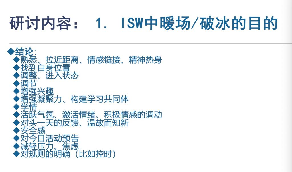 第一轮研讨要点为ISW中暖场/破冰的目的。研讨结果明确其旨在让参与者熟悉彼此,拉近距离,建立情感链接,实现精神热身,帮助参与者找到自身位置,调整并进入良好的学习状态,调节情绪,增强学习兴趣和凝聚力,构建学习共同体,活跃气氛,激活情绪,调动积极情感,对前一天的学习内容进行反馈和温故知新,给予参与者安全感,预告当日活动,减轻压力和焦虑,同时明确教学规则(如控时等)。