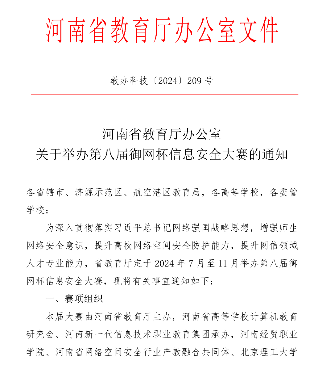 为深入贯彻落实习近平总书记网络强国战略思想,增强师生网络安全意识,提升高校网络空间安全防护能力,提升网信领域人才专业能力,省教育厅定于2024年7月至11月举办第八届御网杯信息安全大赛,本届大赛由河南省教育厅主办,河南省高等学校计算机教育研究会、河南新一代信息技术职业教育集团承办,河南经贸职业学院、河南省网络空间安全行业产教融合共同体、北京理工大学信息系统及安全对抗实验中心协办。