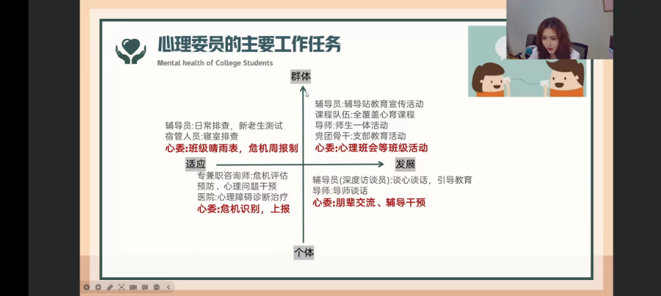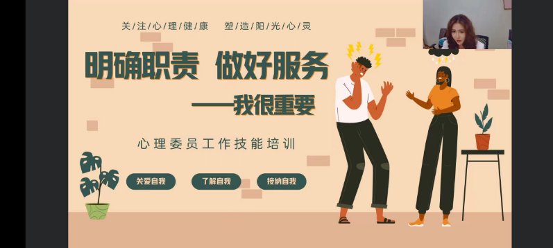 为提升心理委员的专业能力,更好地服务班级同学,建设一支具有较高水平心理自助与助人能力的朋辈心理辅导队伍,心理健康教育中心于10月26日晚对2023级新生心理委员开展了第一期线上专业技能培训,主题为“明确职责 做好服务 我很重要”,本次培训由心理健康教育中心李云佳老师主讲。