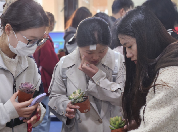 早春的暖阳下,几百盆绿植盛装打扮,期待着一场与主人的邂逅。本次活动将关照绿植与自我关照相结合,通过到梦空间自愿报名的形式参与。在绿植领养活动举办期间,学生们情绪高涨,人头攒动,早早就排起了长队,在工作人员的帮助下,大家竞相“Pick”了自己心仪的植物,并咨询了所获植物的养护指南与注意事项,同学们积极在活动群内互相交流,在朋友圈中打卡记录,分享与绿植的亲密瞬间,广泛宣传绿植领养活动,领取绿植后,大家纷纷表示,要悉心照顾自己的伙伴,呵护它茁壮成长。